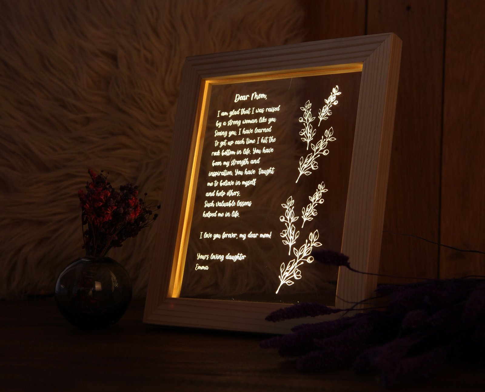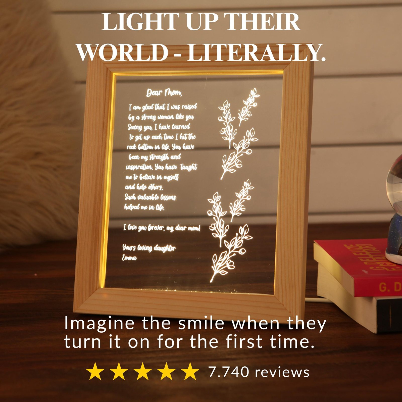 šĀ Mother’s Day Special Letter Night Light: More Than Just a Gift šĀ This Mother’s Day, instead of giving your mother an ordinary gift, present her with the most special gift from your heart. Carry your love to eternity with theĀ Mother’s Day Special Letter Night Light. If you’re looking for a gift filled with love in every letter, and remembered for a lifetime, look no further! Our personalized letter night light for mothers is a keepsake where emotions and memories will be preserved for eternity. This unique lamp carries a letter filled with your words. Every line, every sentence, is a reflection of the love you have for your mother. This letter lamp serves as an emotional bridge, allowing you to express your feelings. In any case, this lamp will shed light on your mother’s heart and remind her how precious she is.
